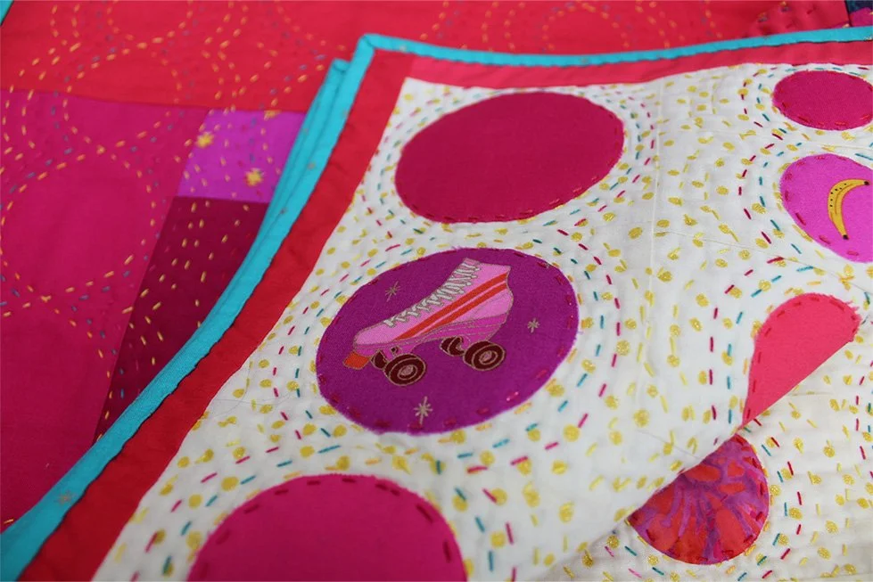 I used fusible interfacing for the circles and hand stitched them down using a running stitch. The quilt is hand quilted in magenta, yellow and teal threads.